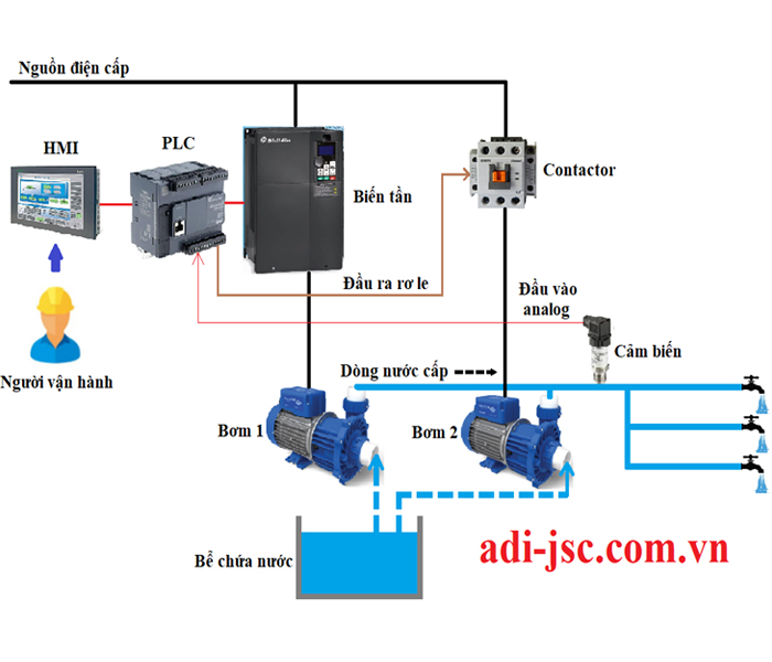 PLC sẽ điều khiển biến tần theo giải thuật PID và sẽ gọi bơm phụ tự động. Sử dụng HMI để người vận hành cài đặt và điều khiển